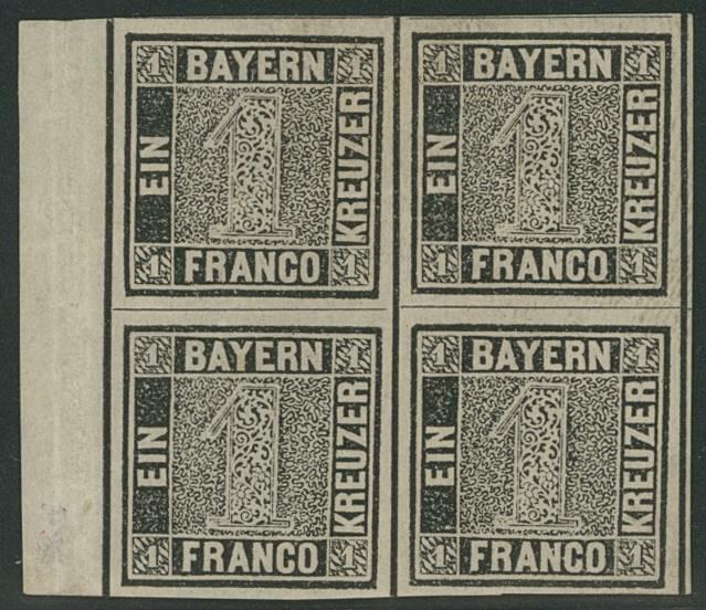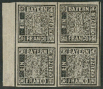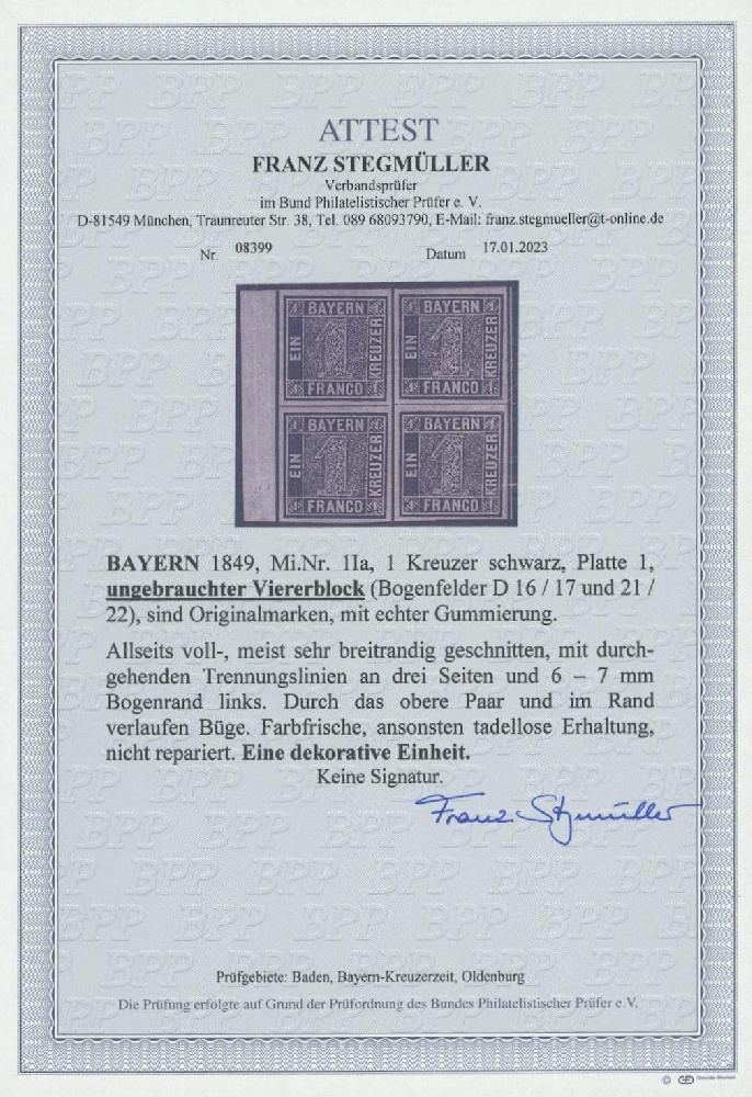 | Zusatzinformationen und Suchstichworte: | Ulrich Felzmann 177. Auktion 8. - 11. März 2023 Los 1370 Altdeutschland Bayern 1 Kr schwarz, Platte 1, ungebrauchter Viererblock der Bogenfelder D 16/17 + 21/22 mit vollem Originalgummi und links 6-7 mm breitem Bogenrand, das obere Paar sowie im Rand Bugspuren, darüber hinaus einwandfrei, farbfrisch und ringsum voll- bzw. meist sehr breitrandig mit dreiseitig vollen Schnittlinien, Fotoattest Stegmüller BPP "Eine dekorative Einheit" Zuschlag 3200,00 EUR |