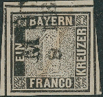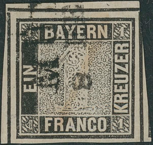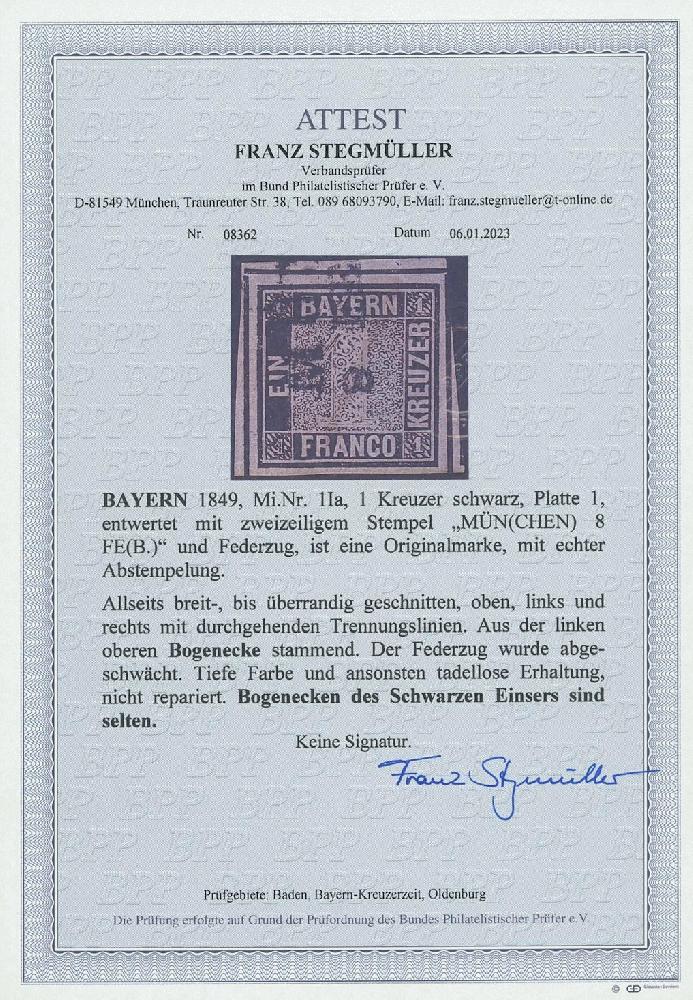 | Zusatzinformationen und Suchstichworte: | Ulrich Felzmann 177. Auktion 8. - 11. März 2023 Los 1371 Altdeutschland Bayern 1 Kr schwarz, Platte 1, ringsum breit- bis überrandig aus der linken oberen Bogenecke (!) mit dreiseitig durchgehenden Trennungslinien, mit abgeschwächtem Federzug sowie senkrecht aufsitzendem Teil-L2 MÜNCHEN 8 FEB. in besonders farbintensiver, attraktiver Gesamterhaltung, Fotoattest Stegmüller BPP "Bogenecken des Schwarzen Einsers sind selten" Ausruf 2.500,00 EUR |