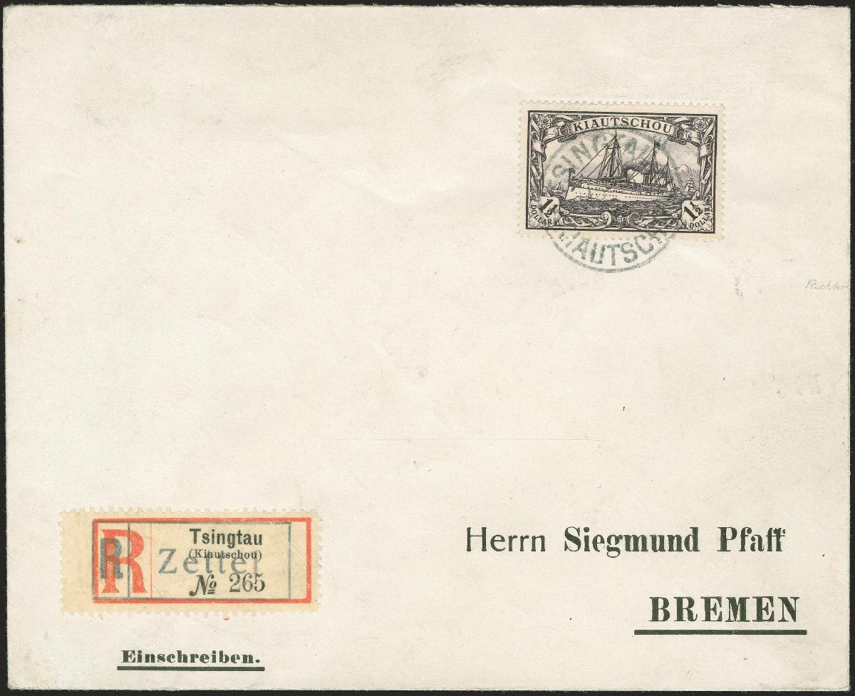 | Zusatzinformationen und Suchstichworte: | Heinrich Köhler - IBRA Sonderauktion - Erivan: Deutschland ab 1872 27. Mai 2023 Los 117 Deutsche Kolonien Kiautschou 1905, 1½ $, 26:17 Zähnungslöcher, mit einem zentrischen Stempel "TSINGTAU 15/10 06" auf philatelistischem R-Brief nach Bremen mit Ankunftsstempel. Fotoattest Jäschke-L. BPP (2023) Zuschlag 800,00 EUR |