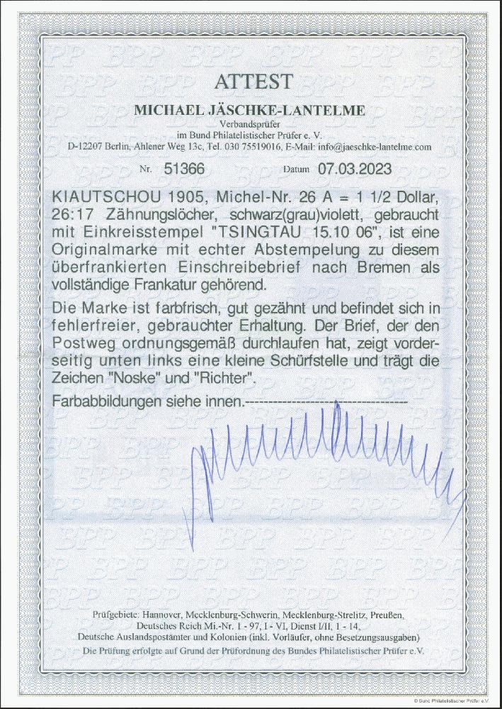 | Prüfer: | Jäschke-Lantelme, Michael (BPP (Bund Philatelistischer Prüfer)) |
