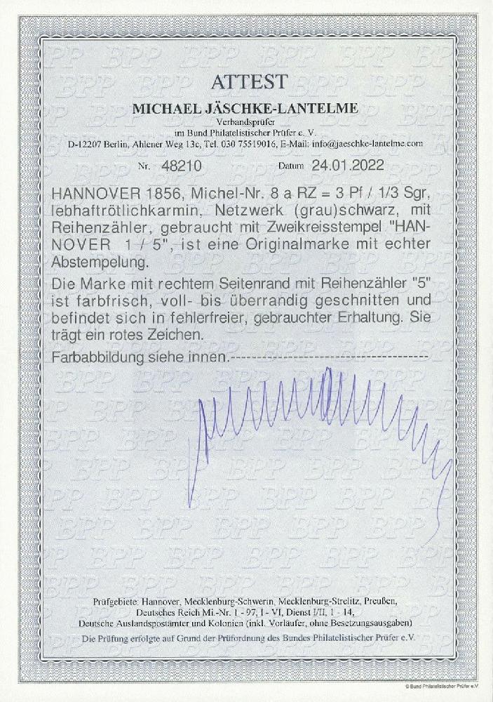 | Zusatzinformationen und Suchstichworte: | Ulrich Felzmann 177. Auktion 8. - 11. März 2023 Los 1406 Altdeutschland Hannover 3 Pfg grau genetzt, rechtes Randstück mit Bordüre und Reihenzahl "5" in gestempelter Prachterhaltung, voll- bis überrandig, Fotoattest Jäschke-L. BPP "... fehlerfreier Erhaltung" Zuschlag 200,00 EUR |