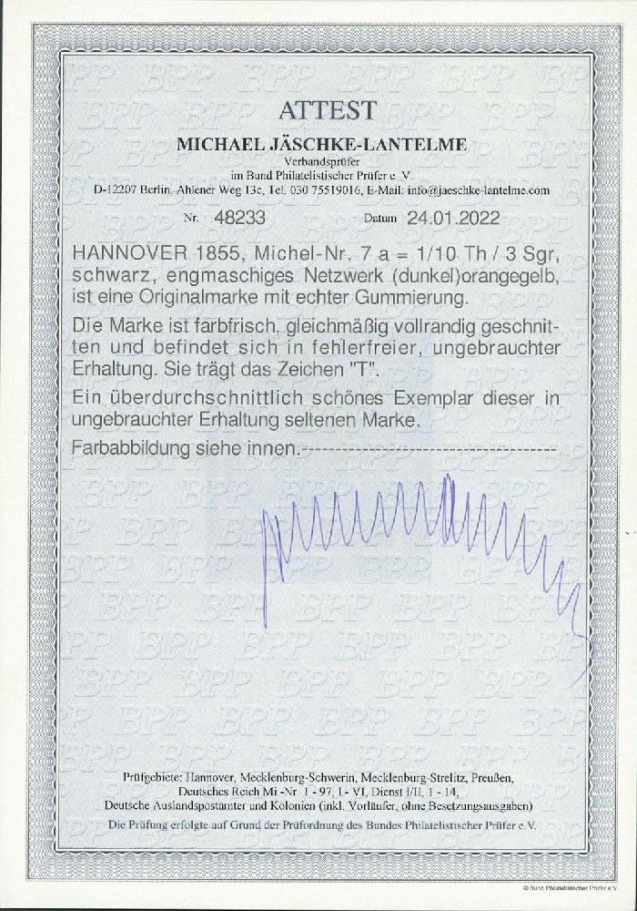 | Zusatzinformationen und Suchstichworte: | Ulrich Felzmann 177. Auktion 8. - 11. März 2023 Los 1405 Altdeutschland Hannover 3 Sgr mit engem orangefarbenem Netzwerk, ungebraucht mit voller Originalgummierung in farbfrischer, ringsum gleichmäßig breit gerandeter Luxuserhaltung, signiert sowie Fotoattest Jäschke-L. BPP "Ein überdurchschnittlich schönes Exemplar dieser in ungebrauchter Erhaltung seltenen Marke" Zuschlag 830,00 EUR |