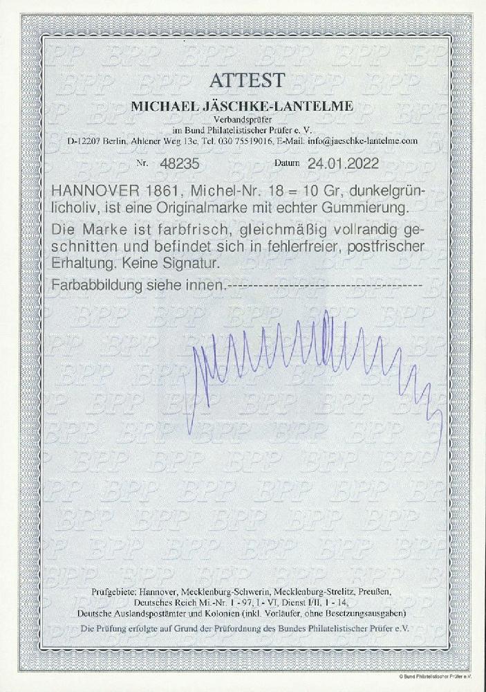 | Zusatzinformationen und Suchstichworte: | Ulrich Felzmann 177. Auktion 8. - 11. März 2023 Los 1408 Altdeutschland Hannover 10 Gr grünlicholiv, ungebraucht mit praktisch unmerklicher Falzspur in farbfrischer, fehlerfreier und ringsum gleichmäßig gut gerandeter Luxuserhaltung, unsigniert mit Fotoattest Jäschke-L. BPP, € 500,- Zuschlag 360,00 EUR |