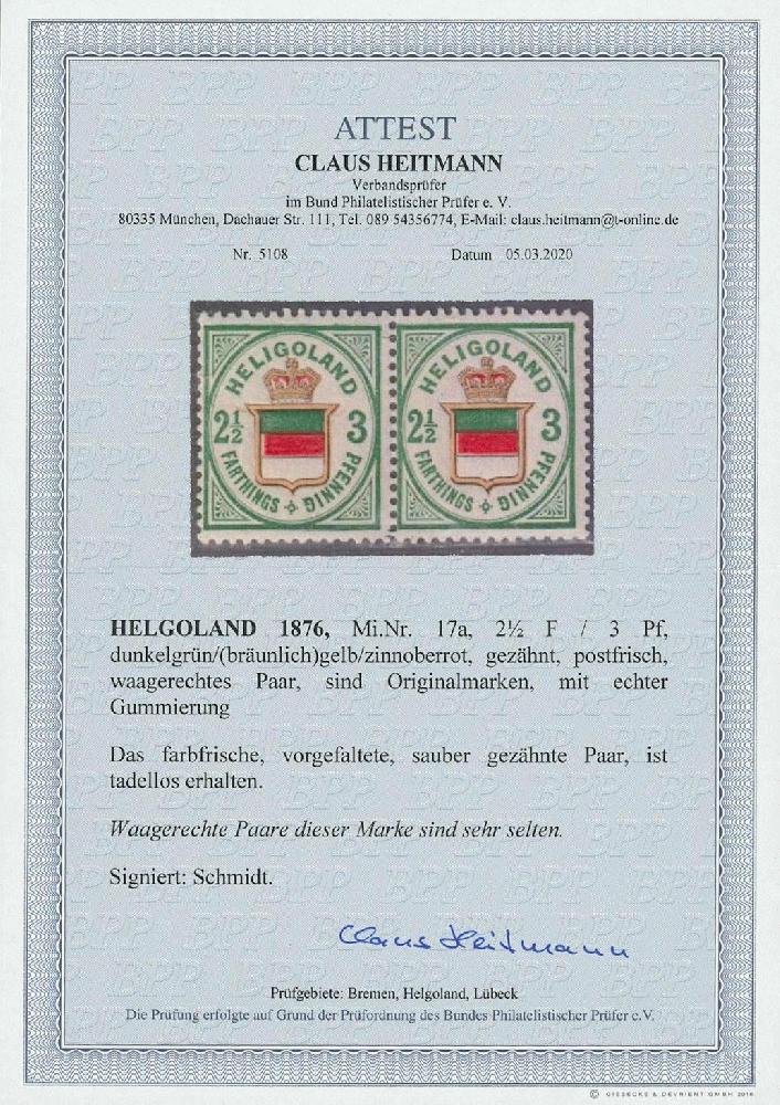 | Zusatzinformationen und Suchstichworte: | Ulrich Felzmann 177. Auktion 8. - 11. März 2023 Los 1409 Altdeutschland Helgoland 2½ F / 3 Pfg Erstauflage postfrisch (!) im waagerechten, vorgefalteten Paar, sauber gezähnt und farbfrisch in einwandfreier Prachterhaltung, sign. Schmidt sowie Fotoatteste Estelmann BPP "... Ausnahmestück ..." und Heitmann BPP "... tadellos erhalten. Waagerechte Paare dieser Marke sind sehr selten" Ausruf 800,00 EUR |