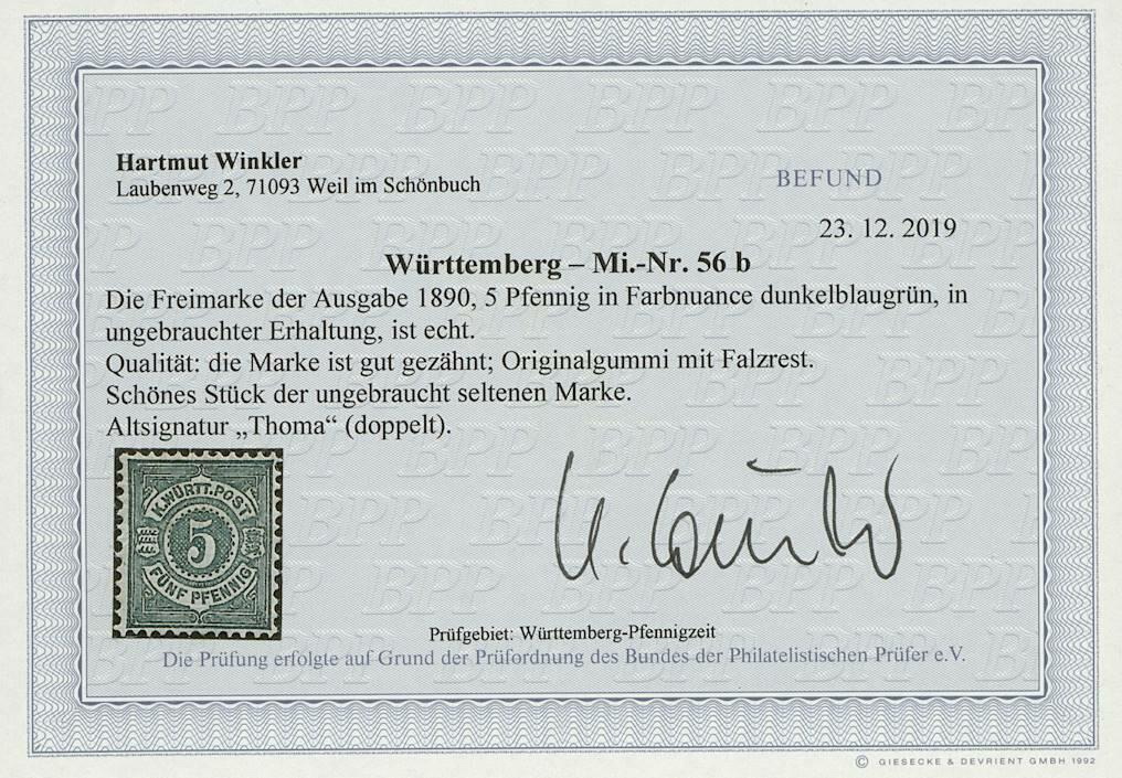 | Zusatzinformationen und Suchstichworte: | Ulrich Felzmann 177. Auktion 8. - 11. März 2023 Los 1422 Altdeutschland Württemberg 5 Pfg schwarzblaugrün in ungebrauchter Kabinett-Erhaltung, gut zentriert und gezähnt, doppelt sign. Thoma sowie Fotobefund Winkler BPP "Schönes Stück der ungebraucht seltenen Marke", € 500,- Ausruf 150,00 EUR |