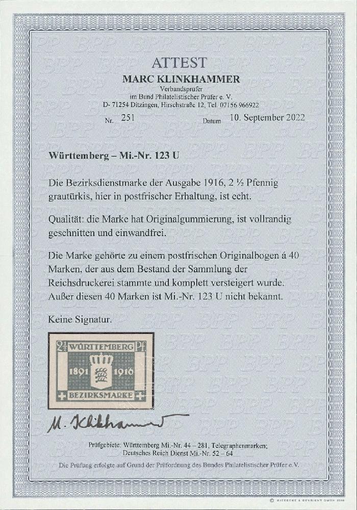 | Zusatzinformationen und Suchstichworte: | Ulrich Felzmann 177. Auktion 8. - 11. März 2023 Los 1423 Altdeutschland Württemberg 2½ Pfg Gemeindedienstmarke ungezähnt, tadellos postfrisch in breitrandiger, unsignierter Top-Erhaltung, Fotoattest Klinkhammer BPP "... einwandfrei" - Aus dem einzig bekannten Bogen mit nur 40 Exemplaren! Ausruf 150,00 EUR |