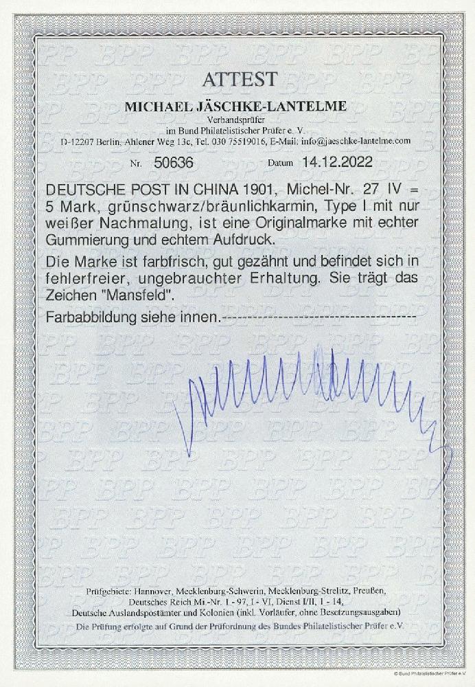 | Zusatzinformationen und Suchstichworte: | Ulrich Felzmann 177. Auktion 8. - 11. März 2023 Los 1635 Deutsche Auslandspost China 5 Mk Reichspost mit nur weißer Nachmalung, ungebrauchtes Kabinettstück mit nahezu unsichtbarer Entfalzungsspur in farbfrischer und gut gezähnter Kabinetterhaltung, sign. Mansfeld sowie Fotoattest Jäschke-L. BPP, € 600,- Ausruf 150,00 EUR |