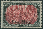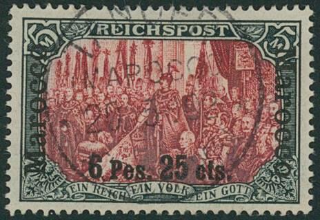 | Zusatzinformationen und Suchstichworte: | Ulrich Felzmann 177. Auktion 8. - 11. März 2023 Los 1641 Deutsche Auslandspost Marokko 6 P 25 C, dünner Aufdruck auf 5 Mk Reichspost ohne Nachmalung, ideal zentrisch mit nur einem einzigem Stempel TANGER 20.5 02 in fehlerfreier Prachterhaltung, farbfrisch und sehr gut gezähnt, Fotoattest Jäschke-L. BPP, € 1.800,- Zuschlag 540,00 EUR |