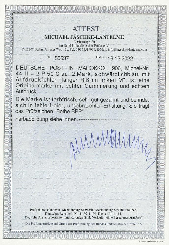 | Zusatzinformationen und Suchstichworte: | Ulrich Felzmann 177. Auktion 8. - 11. März 2023 Los 1647 Deutsche Auslandspost Marokko 2 P 50 C auf 2 Mk mit dem seltenen Aufdruckfehler "langer Riss im linken 'M'", farbfrisch und sehr gut gezähnt in fehlerfreier, ungebrauchter Kabinetterhaltung, sign. Bothe BPP sowie Fotoattest Jäschke-L. BPP, € 600,- Ausruf 150,00 EUR |