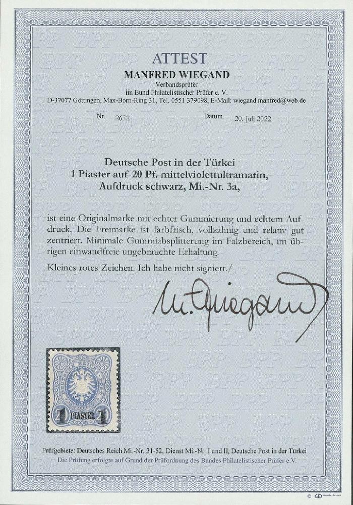 | Zusatzinformationen und Suchstichworte: | Ulrich Felzmann 177. Auktion 8. - 11. März 2023 Los 1650 Deutsche Auslandspost Türkei 1 PIA auf 20 Pfg mittelviolettultramarin, ungebraucht mit minimaler Gummiabsplitterung im Falzbereich in dessen ungeachtet farbfrischer und vollzähniger Prachterhaltung, Fotoattest Wiegand BPP, € 600,- Ausruf 220,00 EUR |