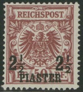 | Zusatzinformationen und Suchstichworte: | Ulrich Felzmann 177. Auktion 8. - 11. März 2023 Los 1655 Deutsche Auslandspost Türkei 2½ PIA auf 50 Pfg Krone/Adler bräunlichrot, dunkelrosarot quarzend, ungebraucht in fehlerfreier Prachterhaltung, farbfrisch und sehr gut gezähnt, sign. Schmidt sowie Fotobefund Jäschke-L. BPP, € 440,- Zuschlag 120,00 EUR |