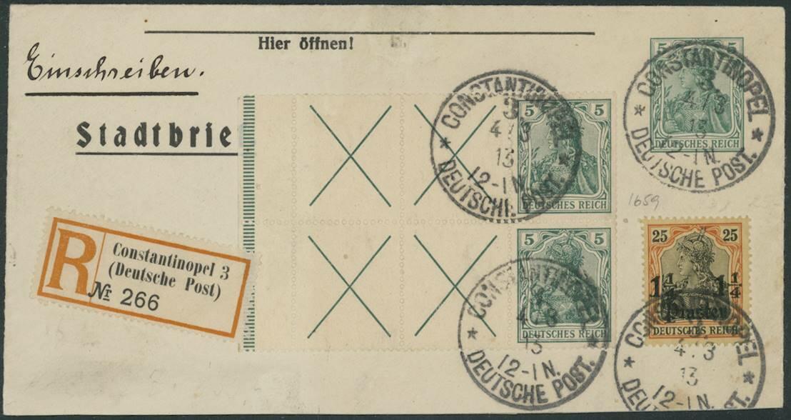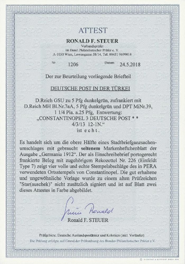 | Zusatzinformationen und Suchstichworte: | Ulrich Felzmann 177. Auktion 8. - 11. März 2023 Los 1663 Deutsche Auslandspost Türkei CONSTANTINOPEL 4/3 13, 1¼ Pia auf 25 Pfg Germania auf großem Privat-GSU-Teil 5 Pfg Germania "Stadtbrief", mit hochwertiger Mitläufer-Beifrankatur, vollständigem Germania H-Blatt 7 a A mit Rand (!) als höchst dekorativer und ungewöhnlicher R-Briefteil, sign. Starauschek sowie Fotoattest Steuer BPP "... ungewöhnliche Vorlage ..." Ausruf 900,00 EUR |
