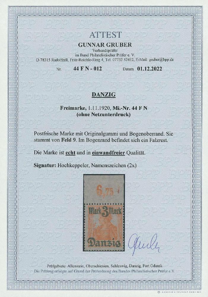 | Zusatzinformationen und Suchstichworte: | Ulrich Felzmann 177. Auktion 8. - 11. März 2023 Los 1803 Danzig 3 Mk auf 7½ Pfg Germania ohne Netzunterdruck, Feld 9 tadellos postfrisch mit vorgefaltet anhängendem Oberrand, dort Falzrest, u.a. sign. Hochkeppeler sowie Fotoatteste Erdwien und Gruber BPP "... in einwandfreier Qualität", € 1.700,- Zuschlag 480,00 EUR |