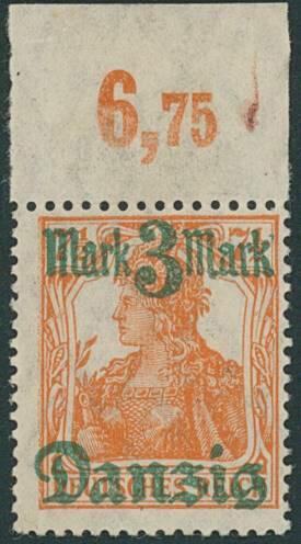 | Zusatzinformationen und Suchstichworte: | Ulrich Felzmann 177. Auktion 8. - 11. März 2023 Los 1803 Danzig 3 Mk auf 7½ Pfg Germania ohne Netzunterdruck, Feld 9 tadellos postfrisch mit vorgefaltet anhängendem Oberrand, dort Falzrest, u.a. sign. Hochkeppeler sowie Fotoatteste Erdwien und Gruber BPP "... in einwandfreier Qualität", € 1.700,- Zuschlag 480,00 EUR |