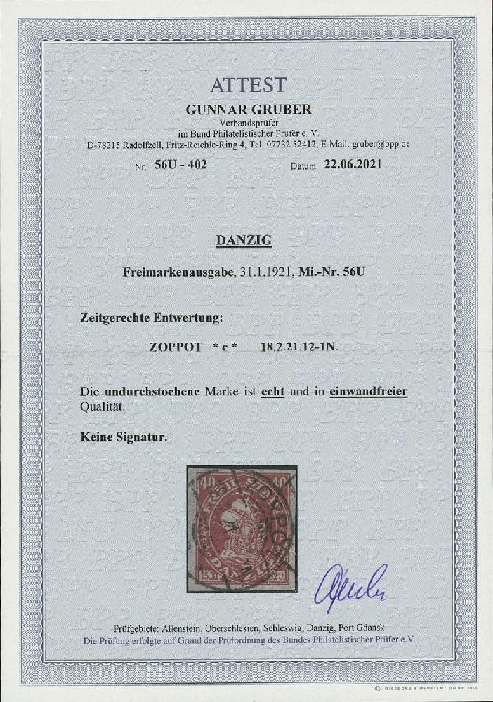 | Zusatzinformationen und Suchstichworte: | Ulrich Felzmann 177. Auktion 8. - 11. März 2023 Los 1806 Danzig 40 Pfg Kogge ungezähnt, zeitgerecht gestempelt ZOPPOT *c* 18.2.21 in breitrandiger Prachterhaltung, Fotoattest Gruber BPP "... in einwandfreier Qualität" Ausruf 500,00 EUR |