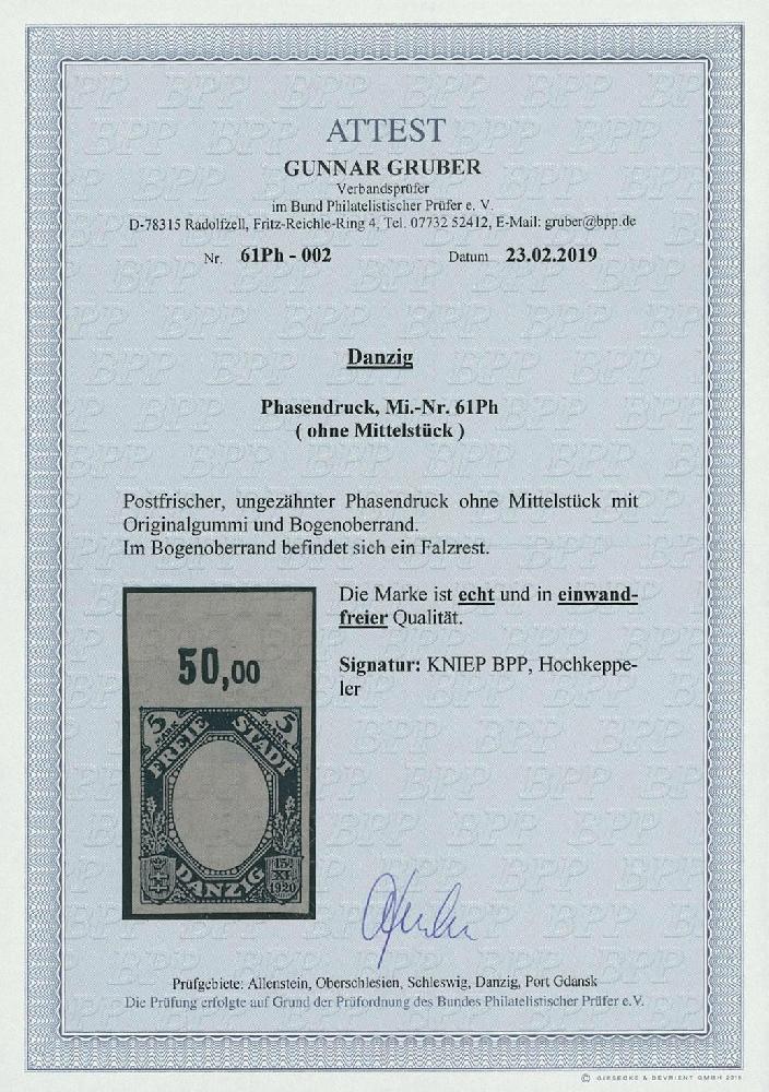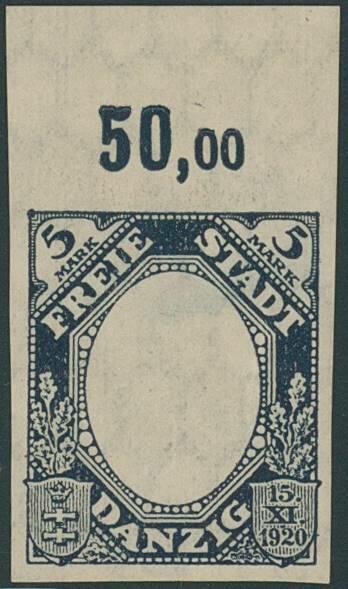 | Zusatzinformationen und Suchstichworte: | Ulrich Felzmann 177. Auktion 8. - 11. März 2023 Los 1807 Danzig 5 Mk Kogge, undurchstochener Phasendruck ohne Mittelstück, äußerst attraktiv mit vollem Bogen-Oberrand, dort Falzspur, die Marke selbst tadellos postfrisch in Prachterhaltung, sign. Hochkeppeler und Kniep BPP sowie Fotoattest Gruber BPP Zuschlag 150,00 EUR |