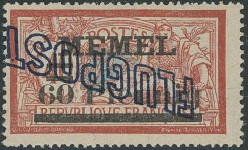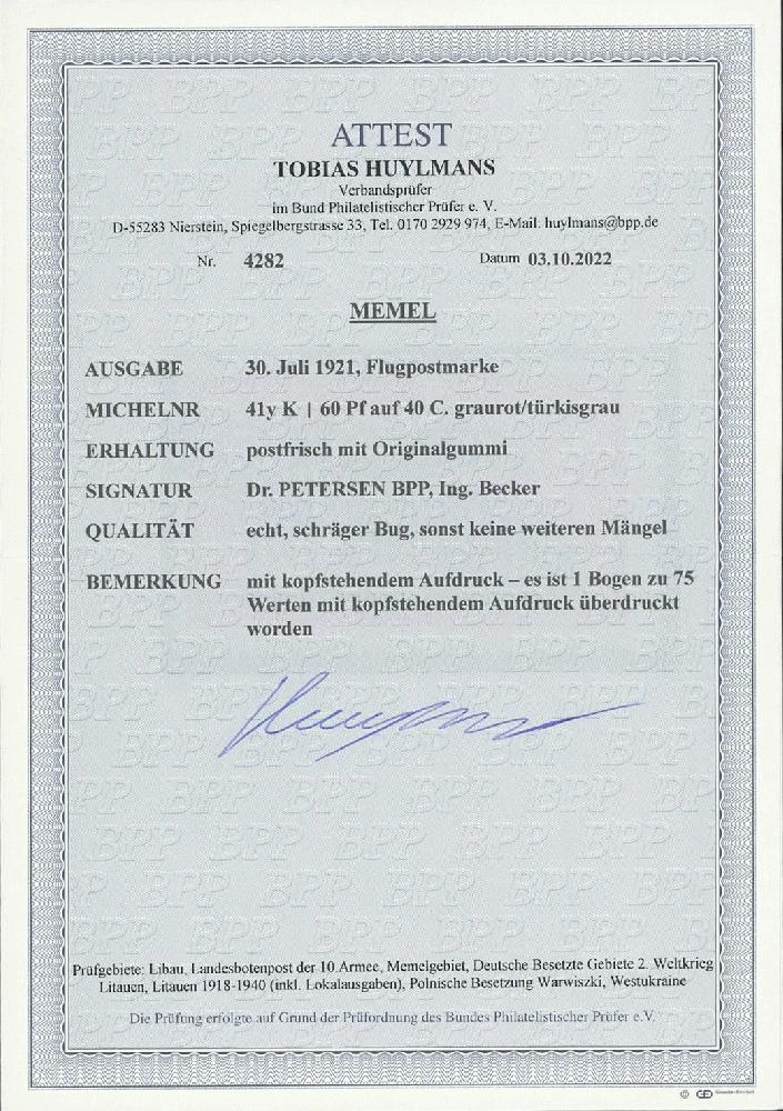 | Zusatzinformationen und Suchstichworte: | Ulrich Felzmann 177. Auktion 8. - 11. März 2023 Los 1834 Memel FLUGPOST kopfstehend (!) auf 60 Pf auf 40 C, postfrisch mit schräger Bugspur in darüber hinaus fehlerfreier, tadellos vollzähniger Prachterhaltung, u.a. sign. Dr. Petersen BPP sowie Fotoattest Huylmans BPP "es ist 1 Bogen zu 75 Werten mit kopfstehendem Aufdruck überdruckt worden", € 550,- Ausruf 100,00 EUR |