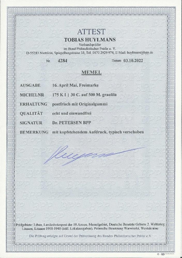 | Zusatzinformationen und Suchstichworte: | Ulrich Felzmann 177. Auktion 8. - 11. März 2023 Los 1835 Memel 30 C auf 500 Mk mit kopfstehendem, typisch markant verschobenem Aufdruck in tadellos postfrischer Kabinetterhaltung, sign. Dr. Petersen BPP sowie Fotoattest Huylmans BPP "... einwandfrei", € 450,- Ausruf 150,00 EUR |