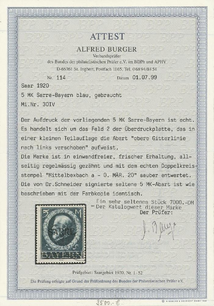 | Zusatzinformationen und Suchstichworte: | Ulrich Felzmann 177. Auktion 8. - 11. März 2023 Los 1846 Saargebiet 5 Mk Sarre/Ludwig mit Aufdruck-Variante "oberste Gitterlinie nach links verschoben", farbfrisch, sehr gut gezähnt, sauber gestempelt MITTELBEXBACH 20.3.20, sign. sowie Fotoattest Burger BPP "... sehr seltenes Stück" Ausruf 700,00 EUR |