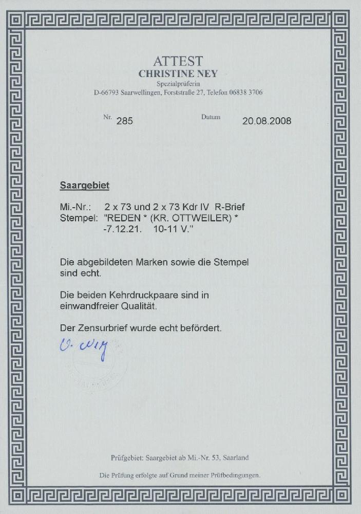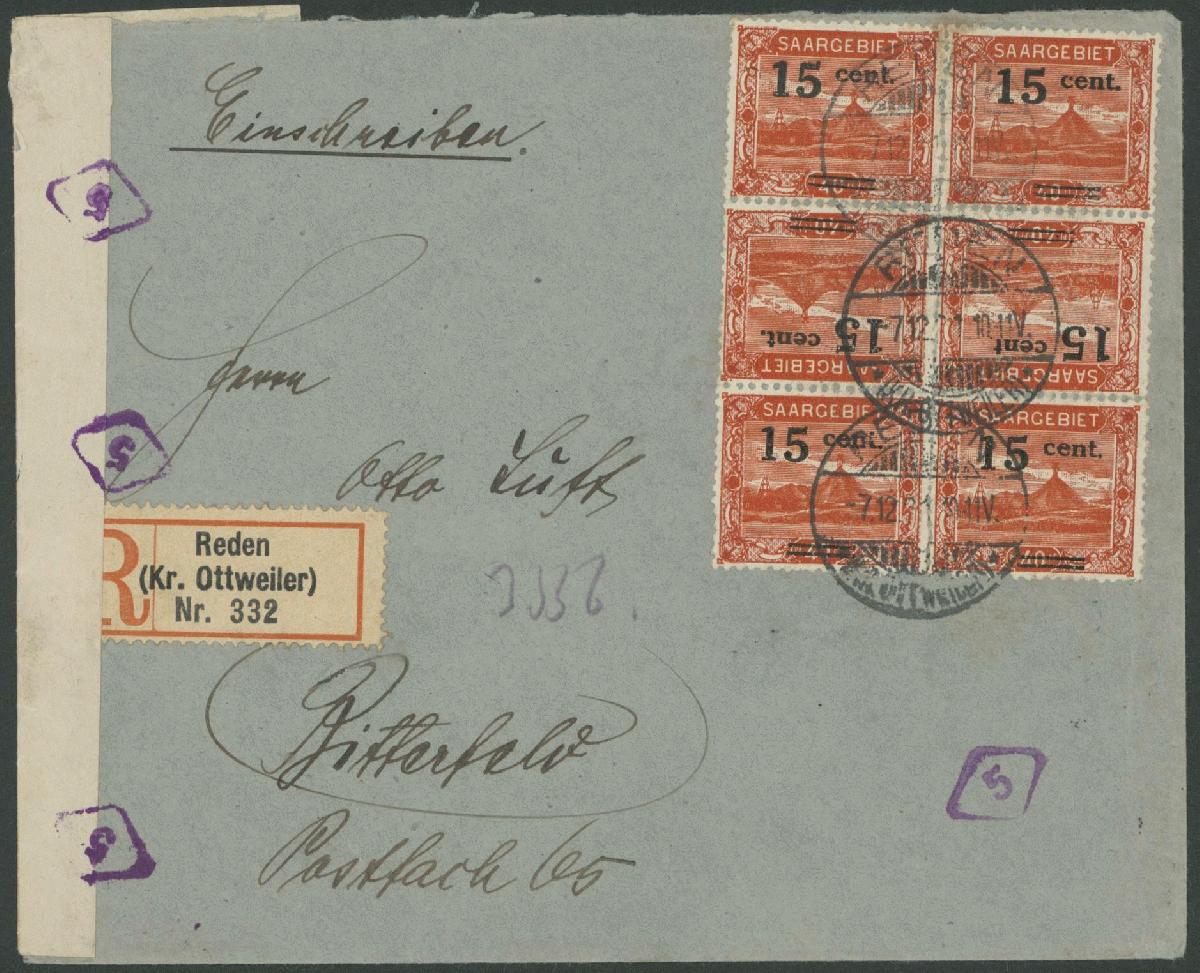 | Zusatzinformationen und Suchstichworte: | Ulrich Felzmann 177. Auktion 8. - 11. März 2023 Los 1851 Saargebiet 15 C auf 40 Pfg im senkrechten Kehrdruck (III) bzw. (IV), je 2x in einem 6er-Block auf Zensur-R-Brief REDEN (Kr. Ottweiler) nach Bitterfeld mit Ankunftsstempel, 1 Marke mit Abart "gespaltener Fuß der 1", Fotoattest Ney "Die beide Kehrdruckpaare sind in einwandfreier Qualität" Zuschlag 460,00 EUR |