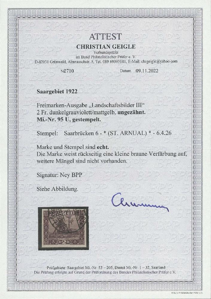 | Zusatzinformationen und Suchstichworte: | Ulrich Felzmann 177. Auktion 8. - 11. März 2023 Los 1856 Saargebiet 2 Fr Landschaften III ungezähnt, mit sauberem Teilstempel ST. ARNUAL 6.4.26 und rs. kleiner brauner Verfärbung in darüber hinaus fehlerfreier, breitrandiger Prachterhaltung, sign. Ney BPP sowie Fotoattest Geigle BPP, € 400,- Ausruf 100,00 EUR |