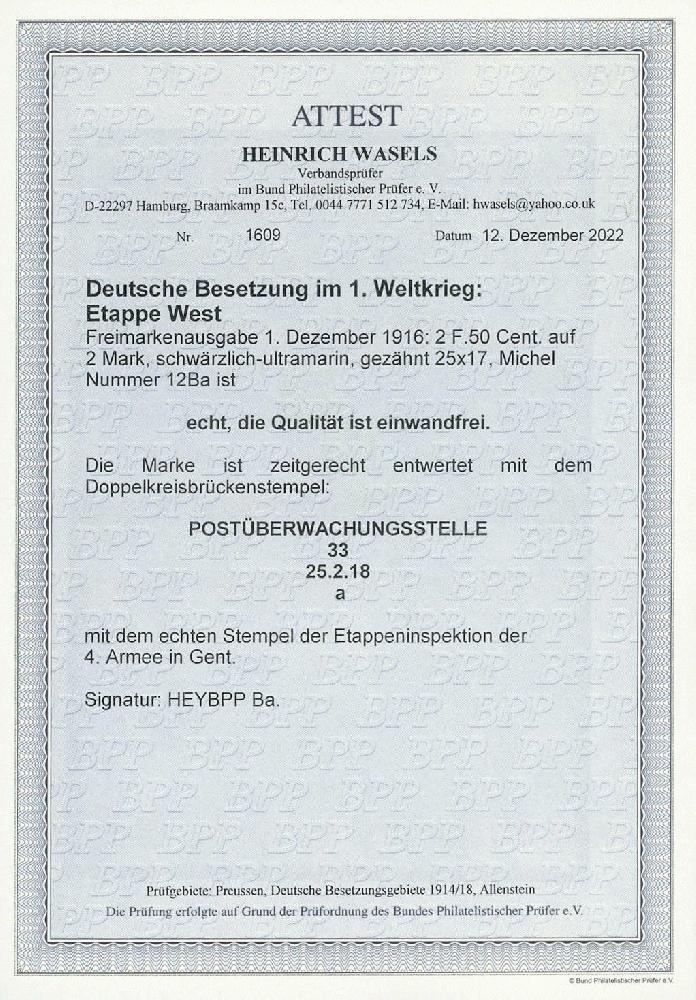 | Zusatzinformationen und Suchstichworte: | Ulrich Felzmann 177. Auktion 8. - 11. März 2023 Los 1752 Deutsche Besetzung I. WK Etappengebiet West 2 F 50 C auf 2 Mk schwärzlichultramarin mit 25:17 Zähnungslöchern, zeitgerecht und zentrisch klar gestempelt POSTÜBERWACHUNGSSTELLE 33 25.2.18 in tadellos gezähnter Top-Erhaltung, sign. Hey BPP sowie Fotoattest Wasels BPP "... einwandfrei", € 1.500,- Ausruf 500,00 EUR |