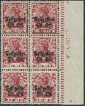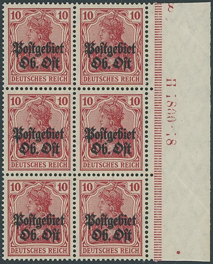 | Zusatzinformationen und Suchstichworte: | Ulrich Felzmann 177. Auktion 8. - 11. März 2023 Los 1755 Deutsche Besetzung I. WK Postgebiet Ober Ost 10 Pfg Germania dunkelrot, zinnoberrot quarzend, postfrischer Rand-Sechserblock rechts mit voller, im Michel-Katalog bislang für diese Farbe nicht spezifizierter Ur-HAN 1800.18 und Plattennummer "8", ungefaltet mit den herstellungsbedingt üblichen kleinen Farbanhaftungen und Kalanderbügen in tadellos postfrischer und unsignierter Luxus-Erhaltung, insofern wohl einmaliges Spitzenstück dieser raren, schon einzeln praktisch nie angebotenen Variante, Fotoattest Wasels BPP "... einwandfrei" Ausruf 7.500,00 EUR |