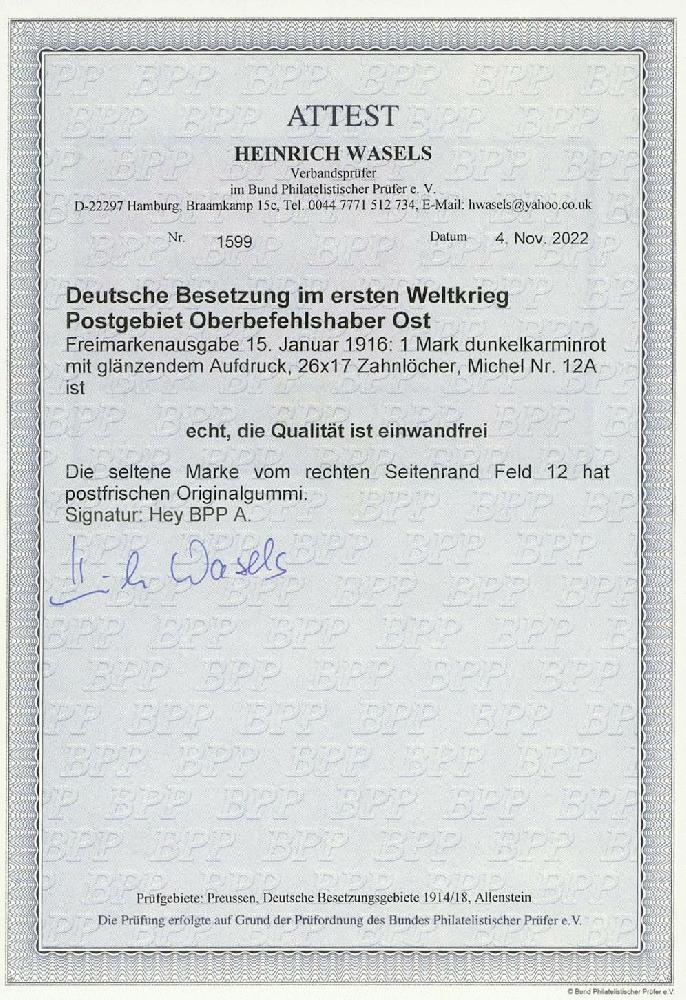 | Zusatzinformationen und Suchstichworte: | Ulrich Felzmann 177. Auktion 8. - 11. März 2023 Los 1757 Deutsche Besetzung I. WK Postgebiet Ober Ost 1 Mk mit 26:17 Zähnungslöchern in postfrischer Top-Qualität, Feld 12 mit Bogenrand rechts, sign. Hey BPP sowie Fotoattest Wasels BPP "... einwandfrei", € 650,- Ausruf 200,00 EUR |