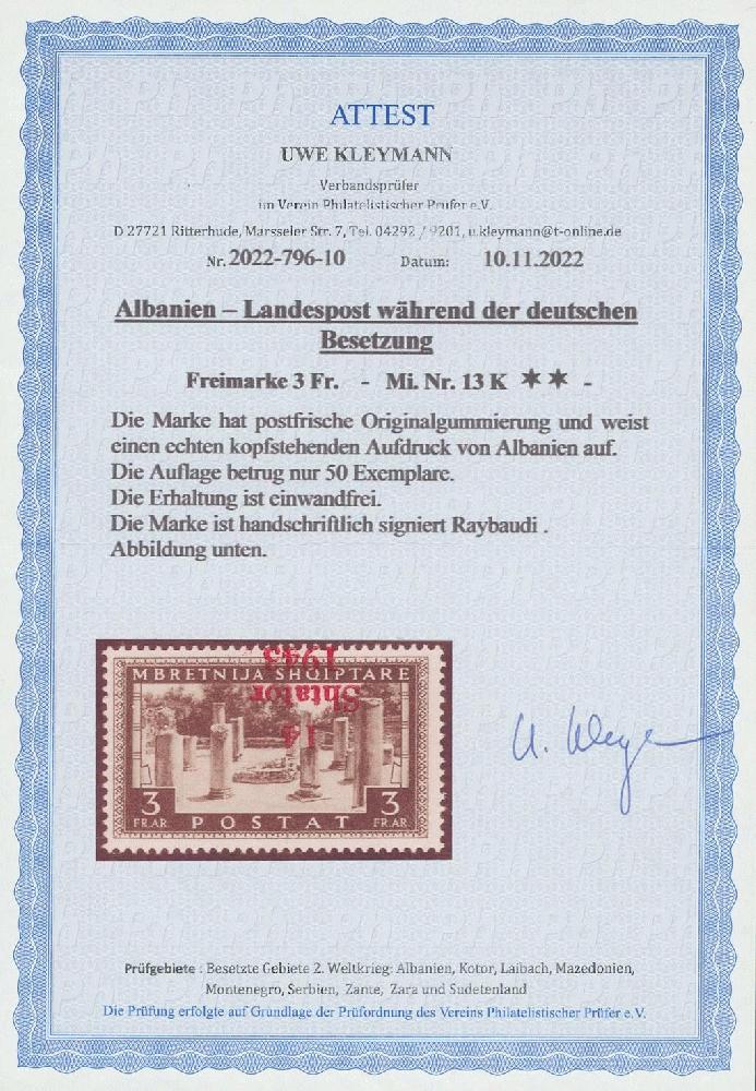 | Zusatzinformationen und Suchstichworte: | Ulrich Felzmann 177. Auktion 8. - 11. März 2023 Los 1932 Deutsche Besetzung II. WK Albanien 3 Fr mit kopfstehendem Aufdruck in tadellos postfrischer Prachterhaltung, sign. Raybaudi sowie Fotoatteste Krischke und Kleymann "Die Auflage betrug nur 50 Exemplare ... einwandfrei", € 800,- Ausruf 250,00 EUR |