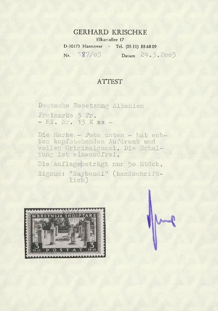 | Zusatzinformationen und Suchstichworte: | Ulrich Felzmann 177. Auktion 8. - 11. März 2023 Los 1932 Deutsche Besetzung II. WK Albanien 3 Fr mit kopfstehendem Aufdruck in tadellos postfrischer Prachterhaltung, sign. Raybaudi sowie Fotoatteste Krischke und Kleymann "Die Auflage betrug nur 50 Exemplare ... einwandfrei", € 800,- Ausruf 250,00 EUR |