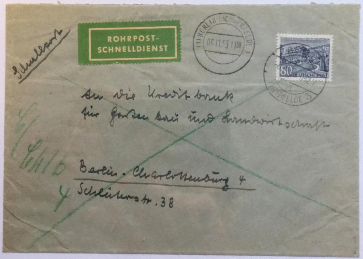 | Zusatzinformationen und Suchstichworte: | Gestempelt, Rohrpost, Schnelldienst, portogerecht |