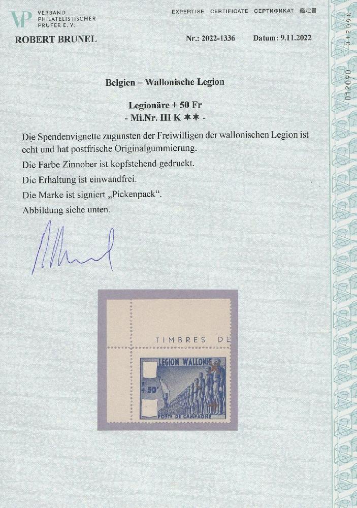 | Zusatzinformationen und Suchstichworte: | Ulrich Felzmann 177. Auktion 8. - 11. März 2023 Los 1938 Deutsche Besetzung II. WK Belgien Wallonische.Legion + 50 Fr gezähnt mit kopfstehendem Eindruck der Farbe Zinnober, linke obere Bogenecke in tadellos postfrischer Luxuserhaltung, sign. Pickenpack sowie Fotoattest Brunel "... einwandfrei", € 600,- Zuschlag 800,00 EUR |