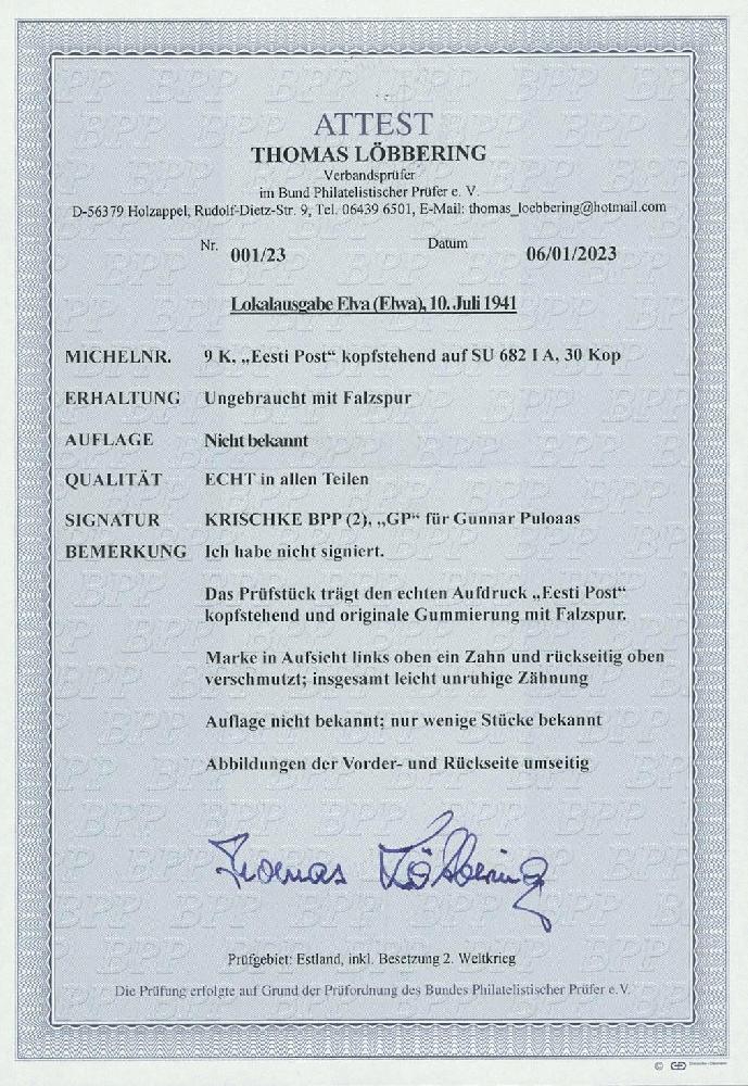 | Zusatzinformationen und Suchstichworte: | Ulrich Felzmann 177. Auktion 8. - 11. März 2023 Los 1943 Deutsche Besetzung II. WK Estland Elwa 30 K Pilot mit kopfstehendem Aufdruck, ungebraucht mit etwas unruhiger Zähnung und teils leichten Flecken, darüber hinaus gut und ursprünglich erhaltenes Exemplar dieser raren Variante, sign. Puloaas, doppelt sign. Krischke mit Fotoattest sowie Fotoattest Löbbering BPP "... nur wenige Stücke bekannt" - Hierzu steht die Katalogbewertung in keinem realistischen Verhältnis Ausruf 1.000,00 EUR |