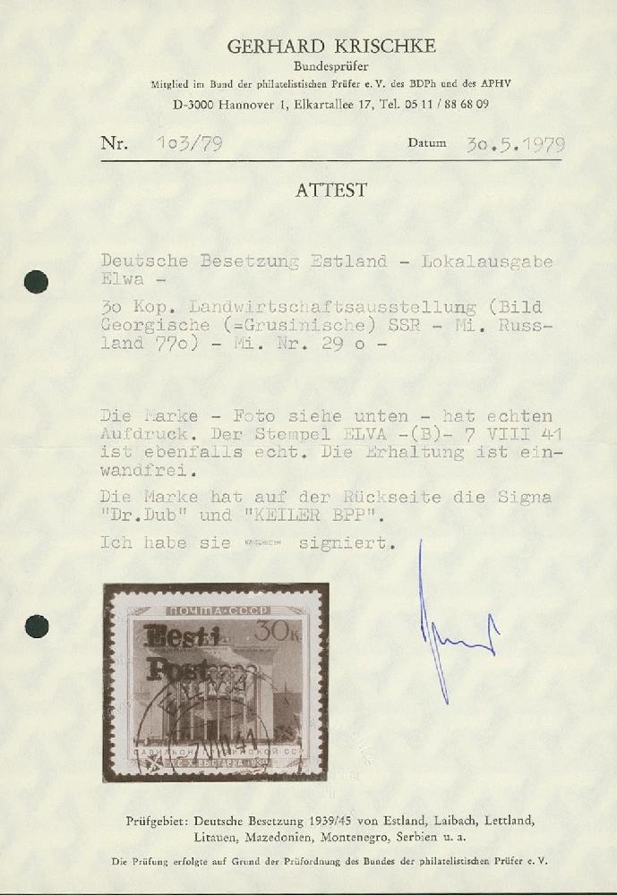 | Zusatzinformationen und Suchstichworte: | Ulrich Felzmann 177. Auktion 8. - 11. März 2023 Los 1947 Deutsche Besetzung II. WK Estland Elwa 30 K Grusinische SSR, zentrisch zeitgerecht gestempelt in farbfrischer, fehlerfreier Prachterhaltung, u.a. signiert Keiler BPP sowie Fotoatteste Krischke und Löbbering BPP "... einwandfrei", € 800,- Zuschlag 400,00 EUR |