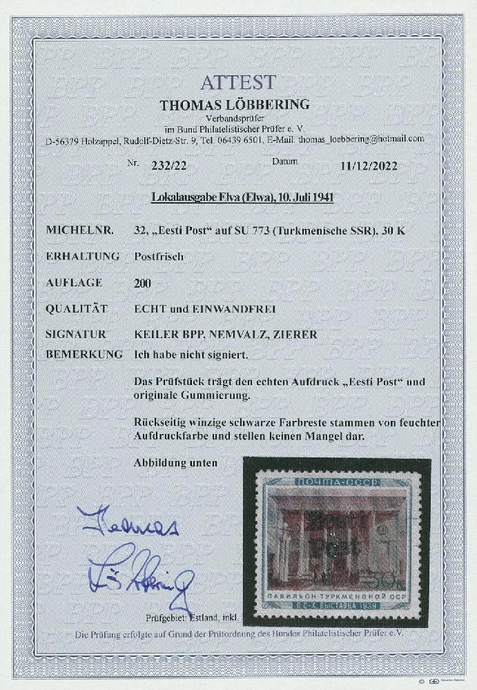 | Zusatzinformationen und Suchstichworte: | Ulrich Felzmann 177. Auktion 8. - 11. März 2023 Los 1948 Deutsche Besetzung II. WK Estland Elwa 30 K Turkmenische SSR, tadellos postfrisch in herrlich frischer Prachterhaltung, u.a. signiert Nemvalz sowie Fotoatteste Dr. Klein und Löbbering BPP - Auflage nur 200 Exemplare, € 800,- Zuschlag 1.000,00 EUR |