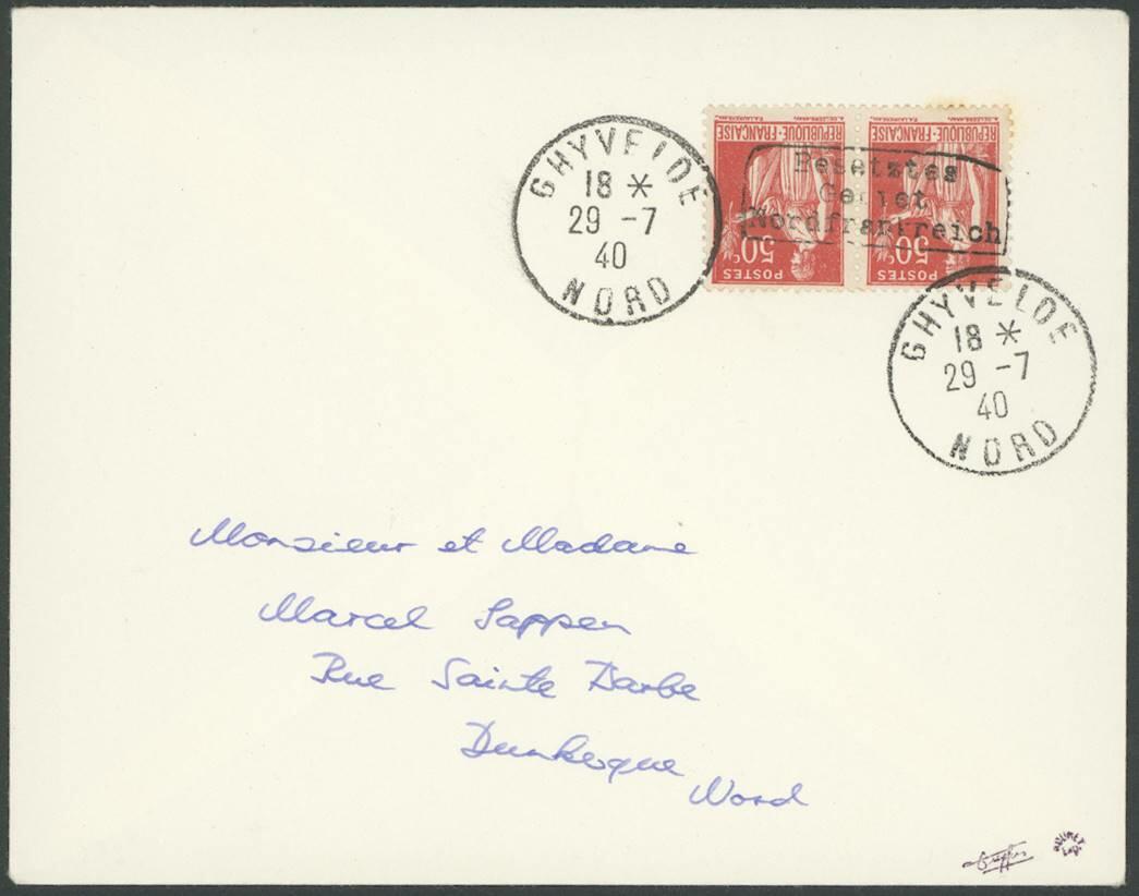 | Zusatzinformationen und Suchstichworte: | Ulrich Felzmann 177. Auktion 8. - 11. März 2023 Los 1953 Deutsche Besetzung II. WK Frankreich Dünkirchen 50 C in Urmarkentype II mit waagerecht kopfstehender Aufdrucktype I im Paar, tarifrichtig auf leicht unfrischem Brief GHYVELDE 29 -7 40 nach Dünkirchen mit rs. Ankunft 30.7.40, sign. Roumet sowie gleich zweifach attestiert Herbst "... einwandfrei ... mit kopfstehendem Aufdruck sehr selten" Ausruf 350,00 EUR |