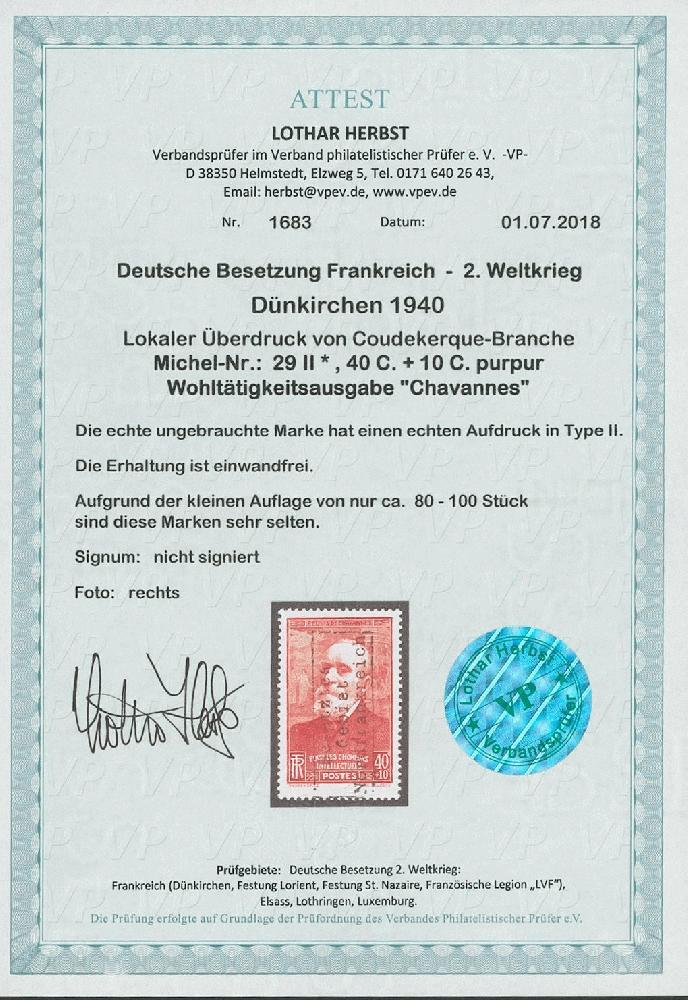 | Zusatzinformationen und Suchstichworte: | Ulrich Felzmann 177. Auktion 8. - 11. März 2023 Los 1971 Deutsche Besetzung II. WK Frankreich Dünkirchen 40 C Chavannes mit lokalem Aufdruck in Type II von COUDEKERQUE-BRANCHE in ungebrauchter und unsignierter Prachterhaltung, Fotoattest Herbst "... einwandfrei ... sehr selten", € 1.800,- Ausruf 500,00 EUR |