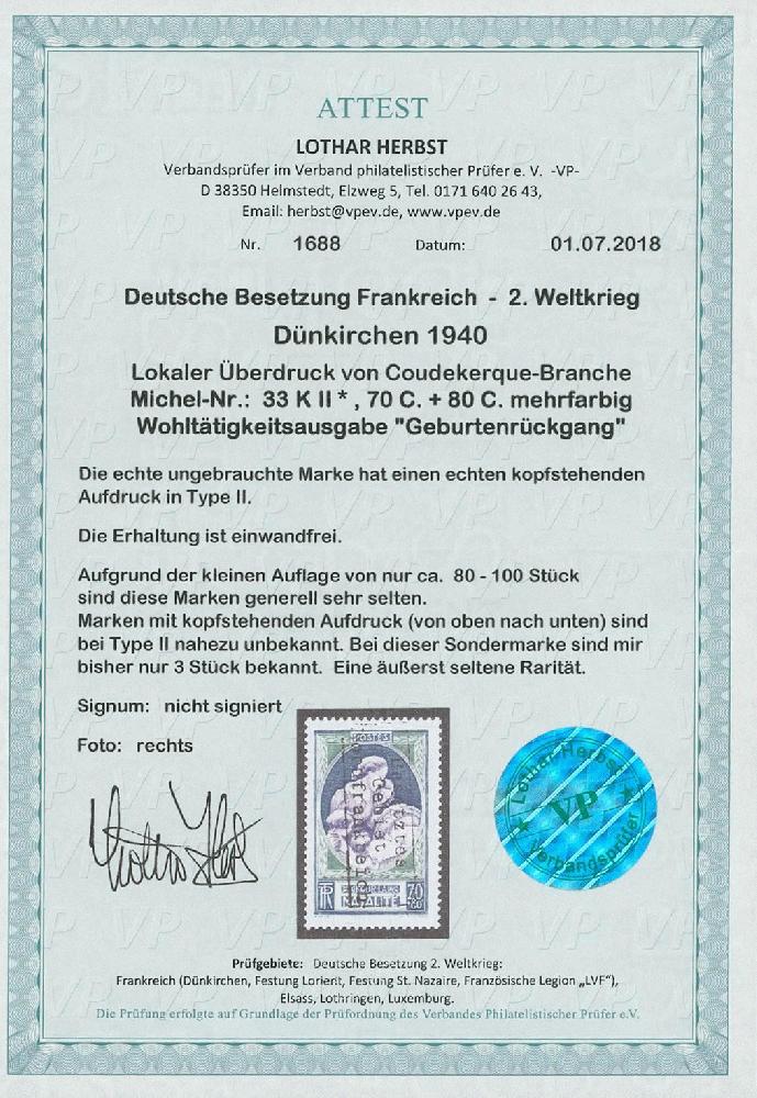 | Zusatzinformationen und Suchstichworte: | Ulrich Felzmann 177. Auktion 8. - 11. März 2023 Los 1973 Deutsche Besetzung II. WK Frankreich Dünkirchen 70 C Geburtenrückgang mit lokalem Aufdruck in Type II kopfstehend (!) abwärts von COUDEKERQUE-BRANCHE in ungebrauchter und unsignierter Prachterhaltung, Fotoattest Herbst "... einwandfrei ... Bei dieser Sondermarke sind mir bisher nur 3 Stück bekannt. Eine äußerst seltene Rarität", € 3.500,- Ausruf 1.000,00 EUR |