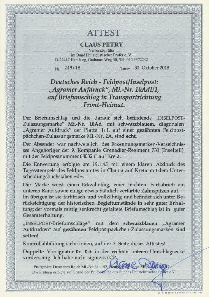 | Zusatzinformationen und Suchstichworte: | Ulrich Felzmann 177. Auktion 8. - 11. März 2023 Los 2142 Deutsche Besetzung II. WK, Feldpostmarken Agram gezähnt, schwarzblauer diagonaler Aufdruck, Platte I/1, Briefumschlag mit Normstempel "d" 19.1.45 und Feldpost-Nr. 68032 nach Bayern, Fotoattest Petry BPP "... sehr selten" Ausruf 950,00 EUR |
