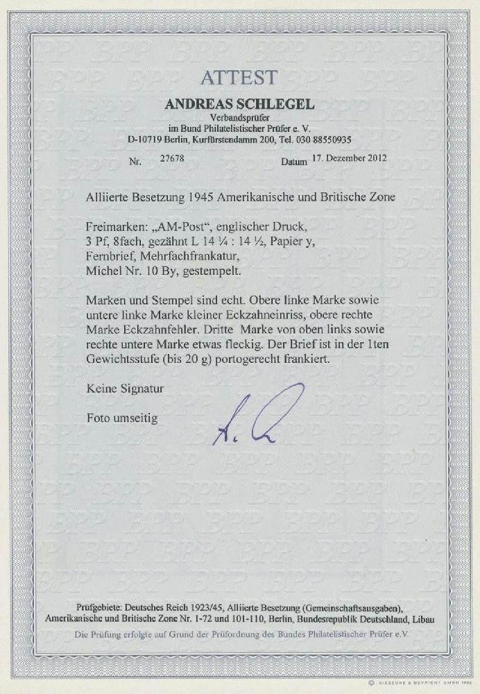 | Zusatzinformationen und Suchstichworte: | Ulrich Felzmann 177. Auktion 8. - 11. März 2023 Los 2320 Bizone 3 Pfg englischer Druck gez. L 14¼:14½, Papier y, MeF mit 8 Werten auf portogerechtem Fernbrief, diverse Beanstandungen, ausführliches Attest Schlegel BPP, € 3.500,- Zuschlag 450,00 EUR |