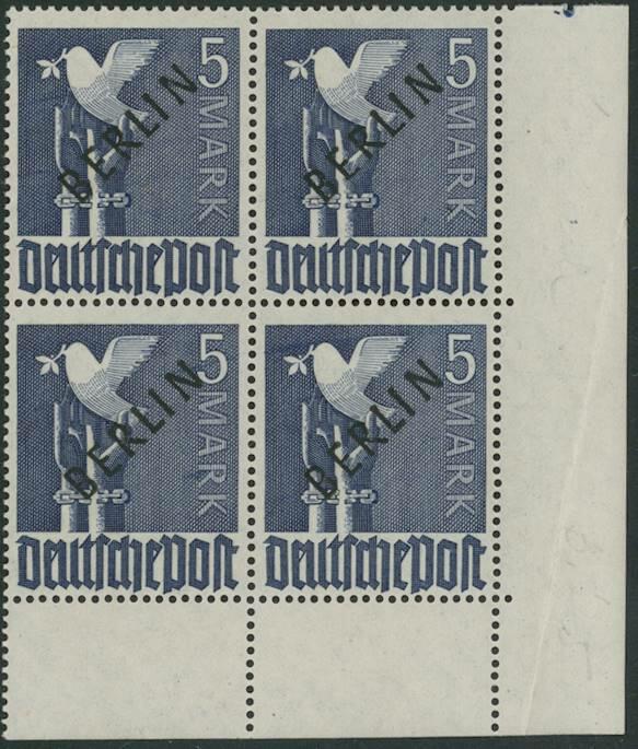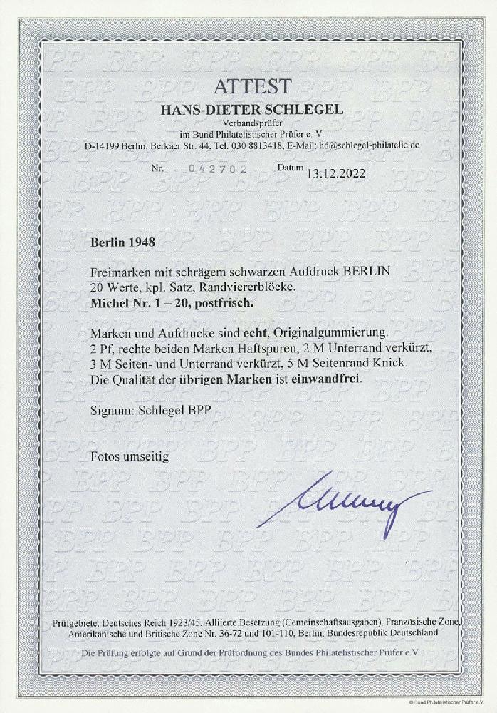 | Zusatzinformationen und Suchstichworte: | Ulrich Felzmann 177. Auktion 8. - 11. März 2023 Los 2258 Berlin Schwarzaufdruck, kpl. postfrischer Rand-Viererblocksatz, Pfennigwerte alle Oberrand, Markwerte untere Bogenecken, in vorwiegend einwandfreier Erhaltung, Fotoattest H.-D. Schlegel BPP Zuschlag 340,00 EUR |