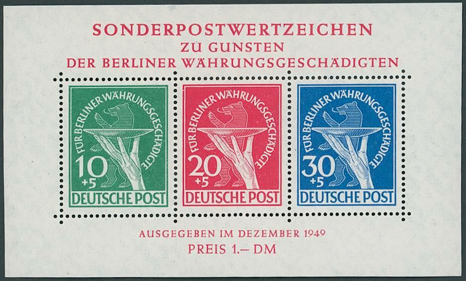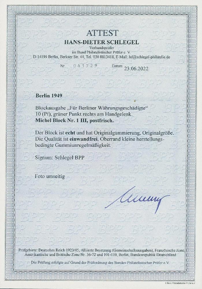 | Zusatzinformationen und Suchstichworte: | Ulrich Felzmann 177. Auktion 8. - 11. März 2023 Los 2268 Berlin Währungsgeschädigten-Block mit Plattenfehler "grüner Punkt am Handgelenk" bei 10 Pfg, bis auf eine kleine herstellungsbedingte Gummiunregelmäßgkeit am Oberrand einwandfrei postfrisch, Fotoattest H.-D. Schlegel BPP, € 2.500,- Ausruf 300,00 EUR |