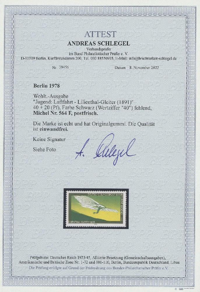 | Zusatzinformationen und Suchstichworte: | Ulrich Felzmann 177. Auktion 8. - 11. März 2023 Los 2272 Berlin 40 Pfg Jugend "Lilienthal Gleiter" ohne Wertziffer, postfrische Abart in unsignierter Top-Qualität, zweifach attestiert H.-G. bzw. A. Schlegel BPP "... einwandfrei", € 2.800,- Ausruf 700,00 EUR |