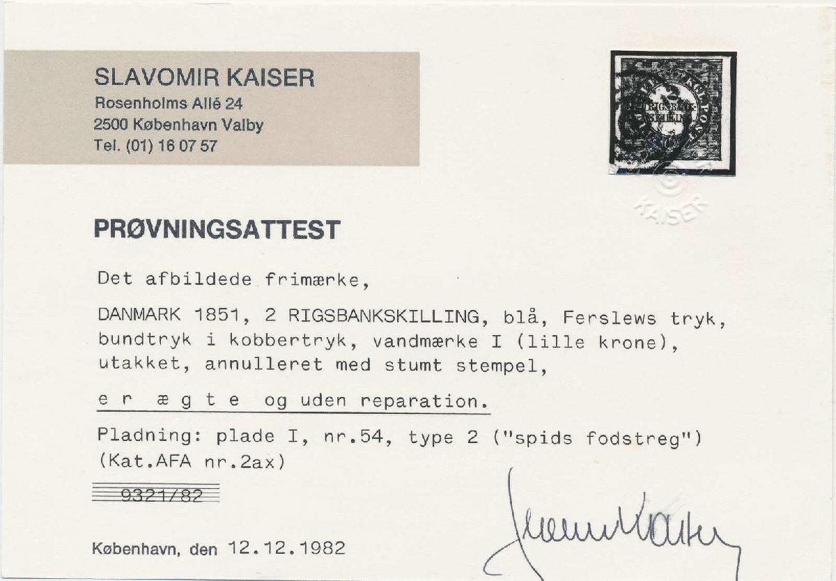 | Zusatzinformationen und Suchstichworte: | Postiljonen 238. Int. Briefmarken Auktion 15. - 17. März 2023 Los 439 ● Dänemark 2 Rigsbank Skilling A fresh copy of 2 RBS Ferslew plate I No. 54 type 2 with disjoined foot of "2" with a distinct mute canc. Certs Kaiser and Møller. VERY FINE COPY Ausruf 600,00 EUR |