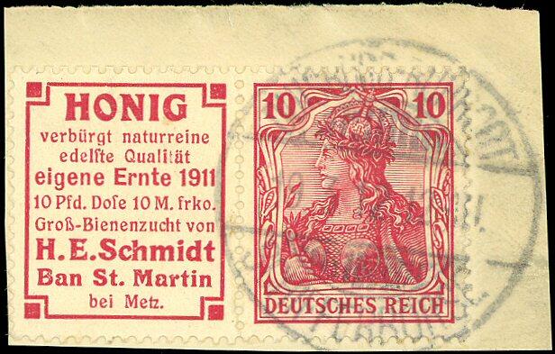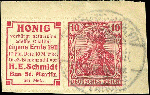| Zusatzinformationen und Suchstichworte: | AIX-PHILA - 71. Briefmarkenauktion 8. - 11. März 2023 Los 607 Deutsches Reich, Germania mit WZ 1911, Germania, ZD 10 Pf mit Reklame "Honig Schmidt", Befund Jäschke-L. (Mi750,-) Zuschlag 260,00 EUR |