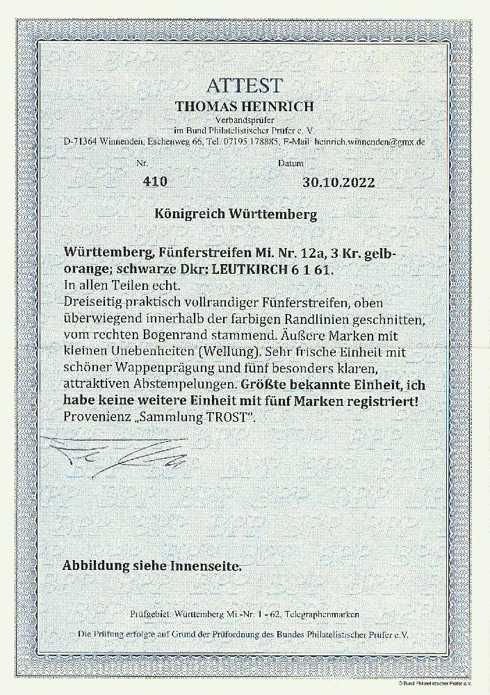 | Zusatzinformationen und Suchstichworte: | Dr. Derichs 169. Auktion - TROST VI - Königreich Württemberg 29. April 2023 Los 1852 Altdeutschland Württemberg \GRÖSSTE BEKANNTE EINHEIT = UNIKAT\: 3 Kreuzer gelborange, waagerechter Fünferstreifen, oben überwiegend innerhalb der farbigen Randlinien geschnitten, sonst voll- bis überrandig, vom rechten Bogenrand stammend, äußere Marken mit kleinen Wellungen, sehr schön gestempelt mit fünfmal aufgesetztem K3 "Leutkirch 6/1 61". Auch der Erwerb dieser unglaublichen Einheit geht auf die Zeit von EUGEN TROST zurück. Fotoattest Thoma BPP und neues Fotoattest Heinrich BPP: "Größte bekannte Einheit, ich habe keine weitere Einheit mit fünf Marken registriert!". Ausruf 3.000,00 EUR |