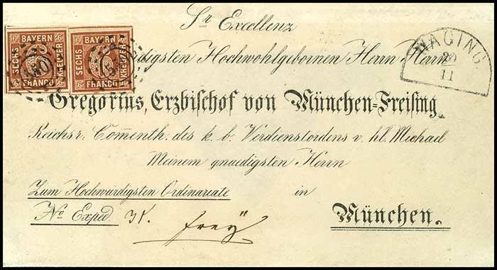 | Zusatzinformationen und Suchstichworte: | Dr. Reinhard Fischer 191. Auktion 31. März - 28. April 2023 Los 22 Altdeutschland Bayern 6 Kreuzer braun, Type II von Platte 3, zwei Exemplare im Paar geklebt auf vorgedruckter Bischofsbriefhülle an Gregorius (von Scherr), Erzbischof von München-Freising (Menzinger 5b), beide Werte ringsum breitrandig mit meist durchgehenden Trennungslinien, je klar entwertet mit oMr "550" - Halbkreis-Nebenstempel"WAGING 20/11" (1860) in aktenfrischer Luxuserhaltung. In der 2. Gewichtsstufe für die II. Tarifzone portorichtig frankiert mit auf Bischofsbrief sehr seltener 12 Kr-Frankatur, Fotoattest Stegmüller BPP "Das bemerkenswert dekorative Ganzstück ist im Handbuch abgebildet" - ex Sammlungen Menzinger und Hußnätter Ausruf 1.400,00 EUR |