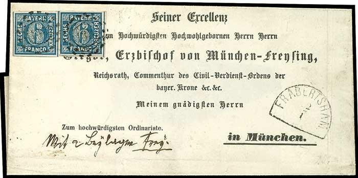 | Zusatzinformationen und Suchstichworte: | Dr. Reinhard Fischer 191. Auktion 31. März - 28. April 2023 Los 28 Altdeutschland Bayern 6 Kreuzer blau, zwei Exemplare im Paar geklebt auf vorgedruckter Bischofsbriefhülle an Gregorius (von Scherr), Erzbischof von München-Freysing (ähnlich Menzinger 6d), beide Werte ringsum breitrandig mit meist durchgehenden Trennungslinien, je klar entwertet mit oMr "133" - Halbkreis-Nebenstempel "Albertsham 22/1" (1863) in aktenfrischer Luxuserhaltung. In der 4. Gewichtsstufe portorichtig frankiert mit auf Bischofsbrief sehr seltener 12 Kr-Frankatur, Fotoattest Franz Stegmüller BPP: "Ein dekoratives und als innerbayerische 12 Kreuzer - Frankatur nicht häufiges Ganzstück." Ausruf 1.200,00 EUR |