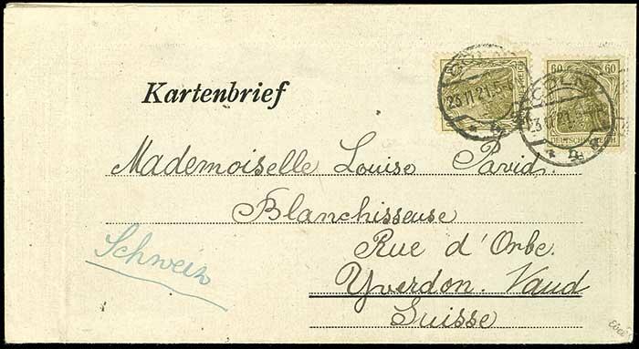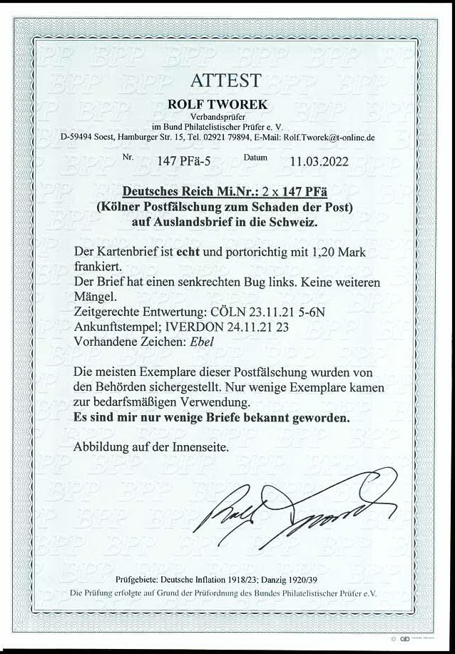 | Zusatzinformationen und Suchstichworte: | Dr. Reinhard Fischer 191. Auktion 31. März - 28. April 2023 Los 494 Deutsches Reich, Germania mit WZ 60 Pfennig Germania oliv, Steindruck ohne Wasserzeichen, Linienzähnung L 13, sog. Kölner-Postfälschung, zwei Exemplare als portogerechte Frankatur auf Auslandsbrief in die Schweiz mit zeitgerechter Entwertung "CÖLN * 4 g 23 22 21 5-6N" mit rückseitigem Ankunftstempel vom 24.IX.21, sehr seltene bedarfsmäßige Verwendung der Postfälschung, da die meisten Exemplare von den Behörden sichergestellt wurden. Es sind nur fünf solcher Belege bekannt! Der Ordnung halber erwähnen wir einen senkrechten Bug links im Kuvert, der die überdurchschnittliche Erhaltung in keiner Weise beeinflusst, signiert Ebel und Fotoatteste Dr. Oechsner BPP und Tworek BPP (2022) Ausruf 6.000,00 EUR |