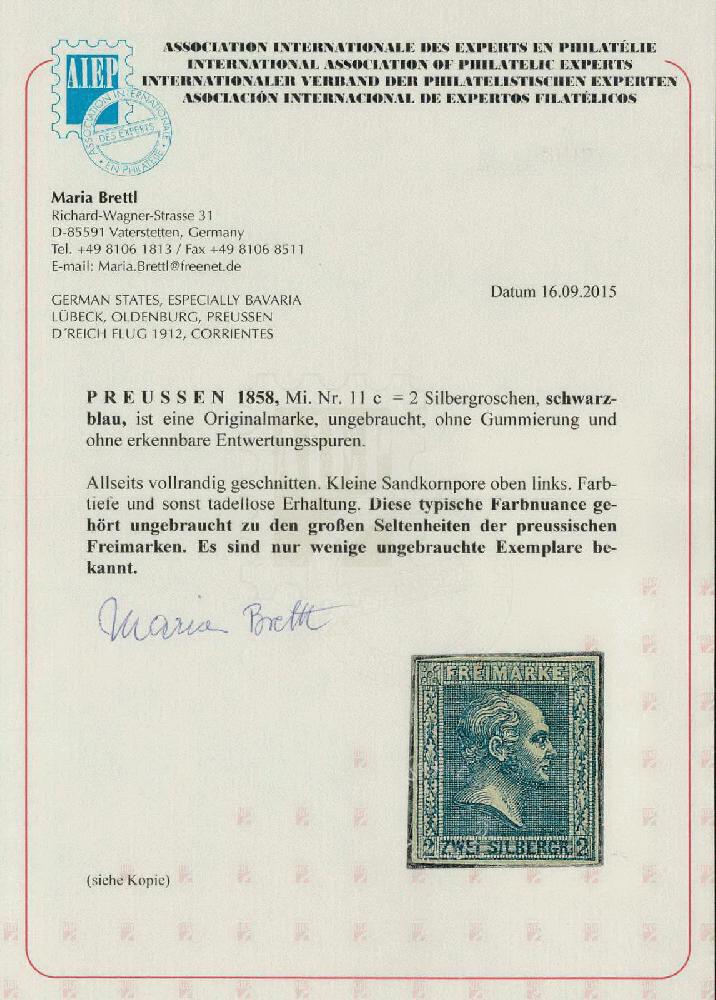| Zusatzinformationen und Suchstichworte: | Marke-Philatelist 2. Auktion 22. März 2023 Los 522 Altdeutschland Preussen Rarität - 2 Silbergroschen schwarzblau - ungebraucht ohne Gummi; mit Attest - siehe Foto Ausruf 5.000,00 EUR |